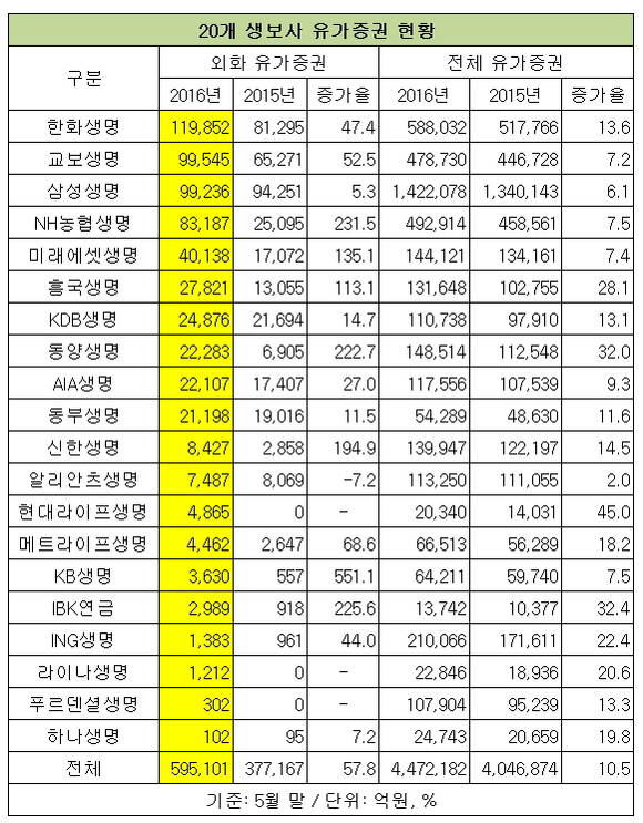 해외 유가증권 규모가 가장 많은 곳은 한화생명으로 11조9852억원을 기록했다. 교보생명은 9조9545억원, 삼성생명은 9조9236억원, NH농협생명은 8조3187억원으로 뒤를 이었다. 미래에셋생명은 외화 유가증권 규모가 4조원대였고 흥국생명, KDB생명, 동양생명, AIA생명, 동부생명 등은 각각 2조원을 웃돌았다.