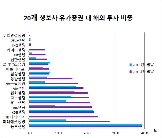 메트라이프생명, 교보생명, 한화생명, ING생명, AIA생명, KDB생명, 동부생명 등 7개사도 해외투자 규모가 작년 5월 말보다 두자릿 수 비율 증가했다. 이밖에 하나생명은 7.2% 증가했고 삼성생명은 5.3% 증가했다.