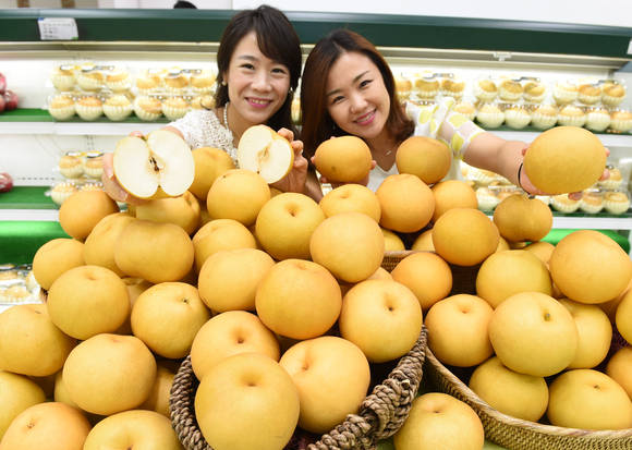 농협유통은 18일 농협하나로마트 양재점에서 추석을 맞아 올해 첫출화된 ‘원황’ 품종의 햇배를 선보였다. 28일까지 5kg 1박스에 1만1400원에 판매한다.