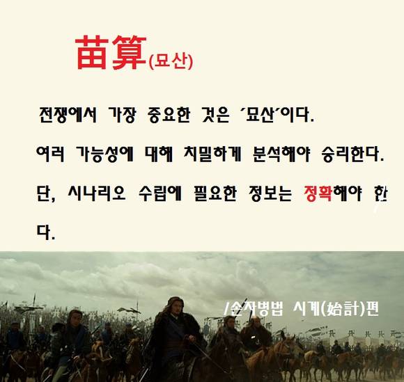 전쟁이든 기업 경영이든 성공하려면 치밀한 시나리오를 짜야 한다. 정확한 정보를 바탕으로 한 시나리오경영 만이 기업을 성장시킬 수 있다. 1980년대 IBM의 한 부서 밖에 되지 않았던 애플이 IBM을 뛰어넘어 미국 최대 IT기업으로 성장한 것은 치밀한 시나리오 경영 덕택이었다.