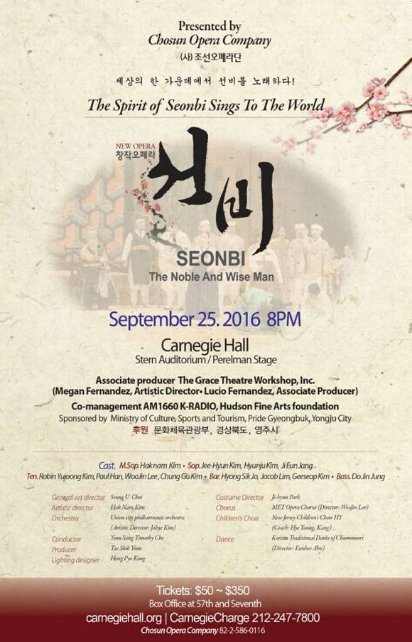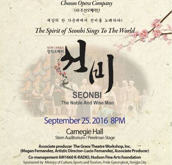 [조선오페라단 최승우 단장 & 주역 소프라노 김지현 인터뷰]'대한민국 오페라 대상'을 받은 창작오페라 '선비'가 미국 뉴욕 카네기홀 무대에 오른다.조선오페라단(단장 최승우)은 9월 25일 뉴욕 맨해튼에 위치한 2,800석 규모의 카네기홀 대극장인 아이작스턴 홀에서 ‘선비’를 공연한다.우리나라 오페라 역사 70년 사상 카네기홀에서 오페라를 공연하는 것은 이번이 처음이다. 오케스트라로는 조윤상이 지휘하는 유니온시티필하모닉오케스트라(예술감독 김자혜)가 협연한다. 연출은 최고의 영상 연출가로 꼽히는 윤태식, 의상감독은 한국을 대표하는 의상전문가 중 한 명인 박지현이 맡았다.'선비'는 지난해 2월 대한민국창작오페라페스티벌에서 초연된 작품이다. 페스티벌 평가회의에서 심사위원 전원 일치로 최고점을 받아 최우수 작품으로 선정됐다. 사랑이나 영웅이야기가 아닌, 선비정신의 뿌리인 유학과 성리학을 도입한 안향선생 등 의로운 선비들의 노력과 사랑을 그린게 특징이다.출연진은 미국과 독일, 한국에서 활동하는 정상급 성악가들로 짜여졌다. 한국오페라단연합회장을 역임한 메조소프라노 김학남이 무대에 오른다. 테너의 경우 김유중(독일) 김충구(미국) 한사명(미국) 이우진(한국)이 출연한다. 바리톤은 임성규 조형식(한국) 김기섭(미국) 베이스 정도진(한국)이, 소프라노는 김지현 상명대 교수와 장지은(미국) 김현주(한국) 등이 열창할 예정이다.▣ 최승우 조선오페라단장 ‘카네기홀에서 한복 입고, 우리 가락 연주’이번 오페라를 추진하는 최승우 조선오페라단장은 “우리나라 오페라 사상 해외공연은 종종 있었지만, 세계에서 손꼽히는 무대인 카네기홀의 문이 열린 것은 이번이 처음”이라며 공연의 의미에 대해 설명했다.그는 “처음에 쉽지는 않을 것으로 생각은 했었는데 실제 추진해보니 ‘산 넘어 산’이었다”며 “깨알 같은 영어가 적힌 수백 페이지의 서류를 채워야 했고, 간단한 것도 모두 계약을 맺어야 했다. 지금도 할 일이 산적해 있다”고 말했다.▷해외 공연으로 뉴욕 카네기홀을 택한 이유는.- 뉴욕은 세계 문화의 중심이다. 세계가 한국 오페라를 주목하고 있는 상황에서 우리의 창작 오페라를 뉴욕에서 올린다는 것은 의미가 크다. 국내에만 머물러선 창작 오페라가 발전할 수 없다. 누군가 시작해야 앞으로 제2, 제3의 도전이 나올 수 있을 것이라 생각한다.▷ 이번 선비 오페라의 특징은.- 기존 오페라에서 많이 다뤘던 막장드라마식 사랑이나 단순한 역사 이야기, 영웅전과 같은 뻔한 스토리에서 탈피했다. 선비정신의 뿌리인 유학과 성리학을 우리나라로 처음 도입한 안향선생과 나라 백성의 어지러워진 마음을 아름답게 가꾸기 위해 소수서원을 건립하려는 의로운 선비들의 노력, 반대 세력과의 갈등과 화해 그리고 선비들의 사랑을 그린다.▷ 어떻게 우리 음악을 담아낼 것인지, 또 어떻게 연출할 것인지.- 정통 오페라 음악에 고유한 우리가락인 중중모리와 자진모리로 하이라이트를 살린 음악적 조화로 한국 창작 오페라의 새로운 차원을 선보이려고 한다.우리나라 성악가들의 탁월한 노래실력과 오케스트라의 웅장한 사운드, 한국 전통의상의 아름다움을 가장 잘 보여줄 수 있는 무대를 만들기 위해 준비하고 있다. 우리 고유의 가락과 한복, 성악가의 특별한 노래의 매력을 선사함과 동시에 한국인들에게는 우리 고유의 선비정신에 대한 자긍심과 깊은 감동을 느낄 수 있도록 하겠다.▷ 글로벌 무대에서 창작 오페라 ‘선비’는 어떤 의미를 갖는지.- 선비 정신은 한국이 세계에 내놓을 수 있는 대표적인 정신문화 유산이다. 고려 말 혼탁한 세상을 어진 마음으로 바로잡자고 생겨난 것이고, 조선왕조를 오백여 년 간 유지시킨 주축이었다. 정신문화가 퇴조하고 있는 오늘날 한국은 물론 세계적으로 꼭 필요한 정신이 바로 선비정신이다.배우들은 한복을 입고 무대에 오른다. 우리의 가락과 전통 의상의 아름다움을 제대로 보여줄 것이다. 오페라 ‘선비’로 미국과 아시아 순회 공연도 생각하고 있다.▣ 소프라노 김지현 “한국의 문화 수준 알리는 계기”오페라 ‘선비’의 여주인공 유교선 역으로 카네기홀에 서게 된 소프라노 김지현(상명대 성악과 교수)은 “뉴욕의 카네기홀은 세계적인 예술인들이 연주하고 싶어하는 글로벌 톱 무대라고 할 수 있다”며 “조선오페라단의 이번 창작오페라 공연은 그동안 서양에서 들여온 오페라를 우리가 새롭게 만들어 역수출하게 된 사례라는 점에서 한국의 70년 역사에 획을 긋는 사건”이라고 말했다.상명대 성악과를 졸업하고 미국 애리조나주립대에서 박사학위를 취득한 김지현은 지난 2007년 미국 성악교수협회 콩쿠르에서 심사위원 만장일치로 1위에 입상했다. 미국 오페라 평론가들로부터 ‘아시아를 대표하는 소프라노’로 평가 받고 있다.▷ 오페라 주역으로서 ‘선비’ 공연의 의미를 어떻게 평가하는지.- 카네기홀은 아무리 돈을 많이 준다 해도 공연 질이 낮으면 절대 대관을 해주지 않는 곳이다. 최승우 조선오페라단장의 실력과 인맥, 헌신적인 노력이 뒷받침됐기에 무대가 가능하게 됐다고 들었다. 세계 최