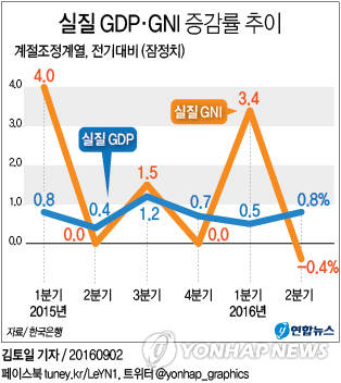 실질 GNI가 전 분기보다 감소한 것은 2014년 3분기(-0.2%) 이후 7분기 만에 처음이다.