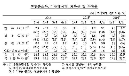 한국은행이 2일 발표한 '2016년 2분기 국민소득(잠정)'에 따르면 2분기(4∼6월) 국내총생산(GDP)은 375조3천336억원(계절조정계열)으로 전 분기보다 0.8% 증가했다.
