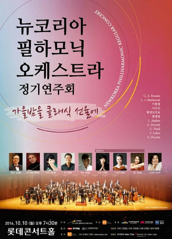 ‘가을 밤을 클래식 선율에~’뉴코리아 필하모닉 오케스트라(예술감독 송재용) 정기연주회가 오는 10월 10일(월) 오후 7시30분 롯데콘서트홀에서 열린다.마르코 발데리가 지휘하는 뉴코리아 필하모닉 오케스트라는 이번 정기연주회에서 오페라 ‘세빌리아의 이발사’ 서곡과 베토벤의 '트리플 콘체르토 in C major. Op.56'을 연주한다.특히 이날 연주는 소프라노 김지현, 테너 이정원, 바리톤 박경준 등 한국을 대표하는 3명의 성악가와 협연할 예정이다. 또 오페라평론가 손수연이 해설을 맡았다.성악가들은 코스모스를 노래함(김지현) 내 맘의 강물(이정원) 신고산 타령(박경준)등 우리 가곡과 함께 달에게 부치는 노래(오페라 루살카, 김지현), 프로벤자 내 고향으로(오페라 라 트라비아타, 박경준) 공주는 잠못 이루고(오페라 투란도트, 이정원) 등 오페라 아리아와 듀엣을 연주한다.사단법인 뉴코리아필하모닉오케스트라는 한국의 예술 발전을 위해 가장 헌신적으로 활동하고 있다는 평가를 받아온 연주단체다.2000년 12월 문화소외 지역을 찾아가는 연주회를 모토로 설립된 오케스트라다. 그동안 전국을 누비며 총 255회의 공연을 감동적으로 펼쳐왔다. 올해의 경우 경기 양평, 강원 횡성, 전남 고흥, 보길도, 추자도를 방문회 연주회를 가질 예정이다.협연하는 3명의 성악가들은 한국의 오페라계를 이끌어온 연주자들로 1968년생 원숭이띠 동갑내기들이다.라 스칼라 무대에 최초로 선 테너 이정원, ‘아시아를 대표하는 소프라노’ 김지현, 유럽 콩쿨을 휩쓴 최정상 바리톤 박경준은 세계적인 지휘자들로부터 ‘세계 어느 무대에서도 손색이 없는 최고의 연주자들’이라는 평가를 받고 있다.연세대를 졸업하고 이탈리아에서 유학한 후 프랑스 리옹 국립오페라에서 데뷔한 테너 이정원은 1998년 이탈리아 프랑코 코렐리 국제 성악콩쿠르에서 1위 수상을 시작으로 2000년 티토 스키파 국제 성악콩쿠르 1위 등 권위 있는 다수의 유럽 콩쿠르에서 뛰어난 실력을 인정받았다.특히 2008년 세계적인 극장인 이탈리아 라 스칼라에 한국인 최초로 오페라 '맥베드'의 주연을 훌륭히 소화하며 기립 박수를 받아 화제를 모았다. 2012년 제4회 대한민국 오페라 대상에서 페스티벌 부문 남자주역상을 받았다.상명대를 졸업한 후 미국 아리조나대에서 박사 학위를 받고 귀국, 지난 2010년 혜성같이 등장한 소프라노 김지현은 힘 있으면서도 청아한 목소리, 탄탄하고 깊은 벨칸토 발성과 풍부한 호흡, 연기력과 미모까지 두루 갖춰 언론으로부터 ‘아시아의 대표 소프라노’라는 평가를 받고 있다.김지현은 2010년 제1회 대한민국 오페라페스티벌에서 베세토오페라단 오페라 '카르멘' 미카엘라역으로 국내 오페라 무대에 데뷔한 후 '토스카' '라 트라비아타' '춘향전' '일 트로바토레' ‘라 보엠’ 등 매년 4~5개의 굵직한 오페라 무대에 주역으로 서며 오페라 '디바'로서의 면모를 과시하고 있다.서울대 성악과를 졸업한 바리톤 박경준은 프랑스 파리 사범고등음악원, 이탈리아 베르디음악원 오페라과 및 예술가곡과를 나와 세계 50여개 극장에서 180회 오페라 주역을 맡았다. 풍부한 성량과 탁월한 감성으로 명성을 얻고 있다. 오페라 ‘라 트라비아타’ ‘일 트로바토레’ ‘팔리아치’ ‘카발레리아 루스티카나’ 등 대부분 유명 오페라 주역을 섭렵했다.중앙콩콜, KBS신인음악콩쿨, 전국 성악 경연대회 등 국내 대회를 휩쓴 이후, 도니제티국제콩쿨을 비롯한 17개 국제콩쿨에서 우승 및 입상했다. 이탈리아 대통령 메달 수상 및 제5회 대한민국 오페라 페스티벌 남자주역상을 받았다. 이탈리아 에르바시립음악학교 교수를 거쳐 현재 영산 콘서바토리 교수로 활동하고 있다.