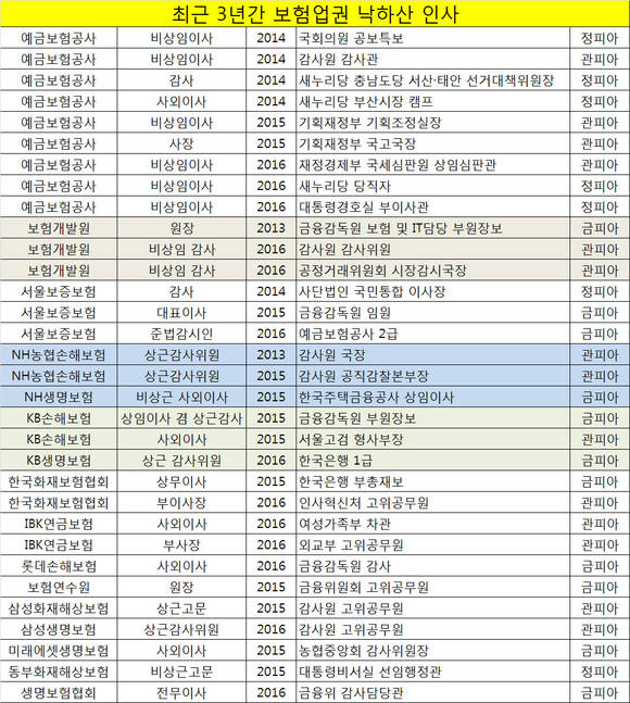 최근 3년간 보험업권 임원급 요직에 관피아·금피아·정피아 등 ‘낙하산 인사’들이 대거 재취업한 것으로 나타났다.