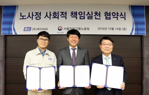 KCC가 지난 14일, 서울 서초동 본사에서 서울지방고용노동청과 고용안정, 일자리 창출, 지역사회 및 협력업체와의 동반성장을 위한 '원, 하청 상생 및 노, 사, 정 사회적책임 실천 협약식'을 가졌다.