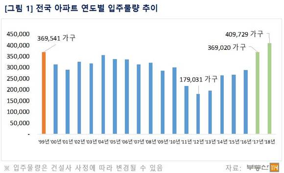 14일 부동산114에 따르면 2014년 이후 아파트 분양물량이 크게 늘면서 2017~2018년 입주물량도 크게 증가한다. 전국 아파트 입주물량은 2017년에만 37만가구에 달한다. 1999년(36만9541가구) 이후 최대 수준. 최근 입주물량이 가장 적었던 2012년(17만9031가구)과 비교하면 두 배 정도 많은 물량이다.
