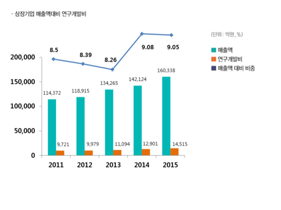 19일 한국제약협회에 따르면 매출액 대비 R&D비율이 상장 국내 제약사(84개) 기준 2013년 8.26%, 2014년 9.08%, 2015년 9.05%로 점진적으로 상승하고 있다.