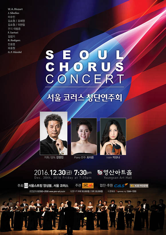실력 있는 젊은 성악가들을 중심으로 구성된 ‘서울 코러스’가 오는 30일(금) 서울 여의도 영산아트홀에서 창단연주회를 개최한다.올해초 민간 프로합창단으로 결성된 서울코러스는 이번 창단 연주회에서 그들만의 독특한 음악과 열정을 펼칠 것으로 기대를 모으고 있다.서울코러스와 서울스트링앙상블 주최, 프로아트엔터테인먼트 주관, CALS, 국민은행 후원으로 열리는 이번 연주회에서 합창단은 모차르트의 대관식미사, 헨델의 할렐루야 등 오리지널 합창곡과 가곡, 가요, 성가 등 다양한 레퍼토리를 선보일 예정이다.서울코러스는 남성 7명, 여성 7명으로 구성돼 있다. 이번 합창에서 전반부는 모차르트의 대관식 미사로 정통 클래식의 음악을 선사하고 후반부는 관객들이 연말의 분위기를 느끼면서 함께 호흡할 수 있는 레퍼토리를 구성했다.특히 콘서트의 분위기를 더하기 위해 바이올린 협연 무대도 마련하고, 익숙한 가요를 클래식하게 편곡해 색다른 느낌을 살렸다.강영진 지휘자(사진)는 “민간 합창단이 많이 사라진 최근 상황에서, 프로들이 순수한 열정으로 참여하는 서울코러스는 레퍼토리에 제약받지 않고 활기 있으면서도 합창의 아름다움을 최대한 펼칠 수 있는 음악을 지향하고 있다”고 말했다.연세대 성악과, 베르디음악원을 졸업한 후 이탈리아, 벨기에, 스위스 등 유럽 유수의 오페라극장에서 솔리스트로 활동했던 그는 “앞으로 관객들이 듣고 싶어하는 음악을 클래식으로 재해석해 선사하는 한편, 소규모 오페라 무대, 찾아가는 음악회 등 다양한 프로그램을 준비하고 있다”고 밝혔다.▣ 서울 코러스 창단연주회▷ 공연일시: 2016년 12월 30일(금) 오후7시30분▷ 공연장소: 영산아트홀▷ 주 최: 서울스트링 앙상블, 서울 코러스▷ 주 관: 프로아트엔터테인먼트▷ 협찬·후원: CALS, 국민은행▷ 회 원 권: R석 5만원, S석 3만원▷ 공연문의: 02)585-2936[[프로그램]]W.A.Mozart / Missa in C krÖnungs-messe KV.317- INTERMISSION -<찬조출연>J.Sibelius / Violin Concerto in d minor Op.47(2, 3악장)<Violin 박한나>이수인 / 별김소월 詩, 조혜영 曲 / 못잊어김소월 詩, 이현철 曲 / 산유화<여성중창>편곡 이범준 / 바람이 분다F.Sartori / Con te partiro<남성중창>김창기 / 우리들은 미남이다R.Rodgers / 여자보다 귀한 것은 없네안효영 / 길우효원 / ‘그가..’G.F.Händel / 할렐루야[[프로필]]▣ 지휘 / 음악감독 강영진-연세대학교 음악대학 성악과 졸업-밀라노 베르디 음악원(Conservatorio di G.Verdi) 졸업-서울시립합창단, 이태리 토리노 레지오 극장(Teatro Regio di Torino) 솔리스트, 스위스 제네바 대극장(Grand-Théâtre de Geneve) 솔리스트, 벨기에 브뤼셀 왕립 모네 극장(Théâtre Royal de la Monnaie) 솔리스트, 스위스 상트갈렌 시립 극장(Stadtheater St. Gallen) 솔리스트-Die Fledermaus, La Traviata, Le Nozze di Figaro, La Fille du Régiment, Turandot, Tosca, Messa da Requiem, L' elisir d' amore, La Cenerentola, Rigoletto, Madama Butterfly, Lucia di Lammermoor, La Clemenza di Tito, Les Vespres Siciliennes, Simon Boccanegra, Romeo et Juliette 등 30여편의 오페라 유럽극장 500여회 출연-Miss Saigon, Evita, Die Drei Musketiere(유럽 초연) 등 뮤지컬 출연-창작 뮤지컬 '미친연애' 음악 총감독, 동아방송예술대학교 방송예술과 출강-오페라 '헨젤과 그레텔' 총감독, '보체삐에나' 오페라단 단장▣ Violin 박한나-선화예술학교, 선화예술고등학교 수석 입학 및 수석 졸업-음악춘추 콩쿠르 중등부 1위, 음악교육신문사 콩쿠르 중등부 1위-성정콩쿠르 중등부 1위, 고등부 1위 및 명지의료재단음악상 수상-TBC콩쿠르 전체대상(고등부1위) 및 경북도립교향악단 협연-제30회, 제33회 젊은이의 음악제 연주-Austria Salzburger Solisten 협연, 예술의전당 IBK챔버홀 연주-연세신포니에타 유망신세대 초청연주-금호영아티스트 독주회 예정(2017.11.4)-연세대학교 음악대학 관현악과 1학년, 사사 김현아▣ Piano 반주 최지은-서울예술고등학교 졸업-한국예술종합학교 음악원 피아노과 예술사 졸업-한국예술종합학교 음악원 예술전문사 1년 수료 후 도독-베를린 한스아이슬러 국립음대 Vordiplom. Diplom(석사) Kammer Diplom(실내악 석사) 졸업, 베를린 한스아이슬러 국립음대 전문연주자과정 졸업, 빈 국립음대 가곡 반주과 수료-음악저널 1위, 틴에이져콩쿠르 특상, 음악춘추 입상, 서울심포니콩쿠르 1위 및 서울심포니오케스트라와 협연, 한국 피아노 듀오콩쿠르 2위-베를린 콩쿠르 3위 및 입상자연주회 라디오중계-귀국독주회(금호아트홀), 영산아트홀 기획 독주회, 세종체임버홀 독주회(2016.3)-예술의전당 콘서트홀 한국 원로교향악단 협연(2016. 7) 서울챔버앙상블, 헨델학회 정기연주회 출연, 다수독주회 반주 및 연주-한국예술종합학교, 인천예술고등학교 강사 역임