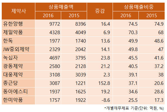 반면 MSD 품목 판권을 종근당에 내준 대웅제약은 상품매출비중이 전년 대비 소폭 감소하며 39.1%로 나타났다.
