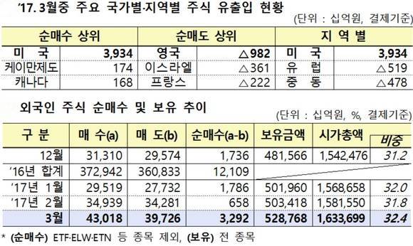 실제 외국인투자자가 3월에만 코스피 상장회사 주식을 3조2000억원 매수하며 주가 상승을 이끌었다. 반면 코스닥은 단 1000억원만 투자해 관심도가 낮았다.
