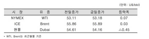 국제유가가 OECD(경제협력개발기구) 재고 감소 영향으로 상승했다.14일 한국석유공사에 따르면 13일(현지시간) 뉴욕상업거래소(NYMEX)의 미국 서부텍사스산원유(WTI) 가격은 전일대비 0.07 달러 상승한 53.18 달러를 나타냈다.영국 브렌트유(Brent) 가격은 배럴당 0.03 달러 오른 55.89 달러를, 두바이유(Dubai) 현물 가격은 54.16 달러로 0.45 달러 하락했다.이날 국제유가는 3월 OECD 재고 감소 및 미국 달러화 약세로 상승했다.IEA는 13일 발간된 월간 보고서에서 OECD 국가의 3월말 기주 재고가 1720만 배럴 감소했다고 발표했다. 2월 OECD 재고는 810만 배럴 감소해 30억5000만 배럴을 나타냈다.IEA는 비OECD 국가 중 이란의 해상 재고가 지난해 초 2800만 배럴에서 400만 배럴로 줄었다.한편 미국 원유 시추기수는 전주보다 11기 증가한 683기를 기록했다.