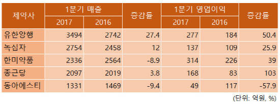 상위제약사들이 1분기 전반적으로 양호한 실적을 기록한 가운데 유한양행이 유일하게 매출 3000억원을 돌파하며 선두체제를 굳건히 하고 있다.