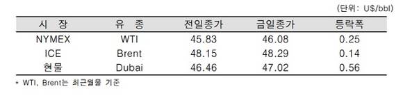 국제유가가 사우디 원유 수출 축소 소식에 상승했다.13일 한국석유공사에 따르면 12일(현지시간) 뉴욕상업거래소(NYMEX)의 미국 서부텍사스산원유(WTI) 가격은 전일대비 0.25 달러 상승한 46.08 달러를 나타냈다.영국 브렌트유(Brent) 가격은 배럴당 0.14 달러 오른 48.29 달러를, 두바이유(Dubai)는 47.02 달러로 0.56 달러 상승했다.이날 국제유가는 사우디 원유 수출 축소 및 미국 원유 재고 감소가 예상되며 상승했다.사우디가 감산 합의 이행을 위해 아시아, 미국, 유럽향 7월 물량을 줄일 계획인 것으로 알려졌다.사우디아람코사는 지난 6월에도 아시아 수출 물량을 약 700만 배럴 줄인 바 있다.축소 대상에는 인도, 중국, 한국 등 최소 5개 아시아 국가가 포함될 예정이며 일본, 타이완 등으로의 원유 수출량은 유지할 예정이다.또한 미국 및 유럽으로의 7월 원유 수출량도 6월 대비 각각 35%와 11% 줄일 것으로 전해졌다.한편 지난달 말 미국 원유 재고는 5억1300만 배럴을 기록하며 9주만에 증가한 바 있다.