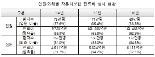 2016년 자동차보험 진료환자 중 입원 환자는 69만명(33.8%) 입원진료비는 1조 433억원(62.9%)으로 매해 꾸준히 감소했다. 반대로 외래진료비는 4511억원(31.7%)에서 6153억원(37.1%)로 증가해 그 비중이 높아지고 있다. -