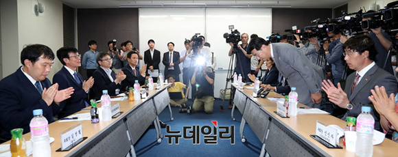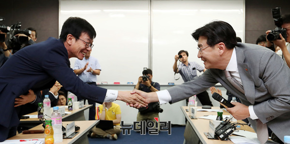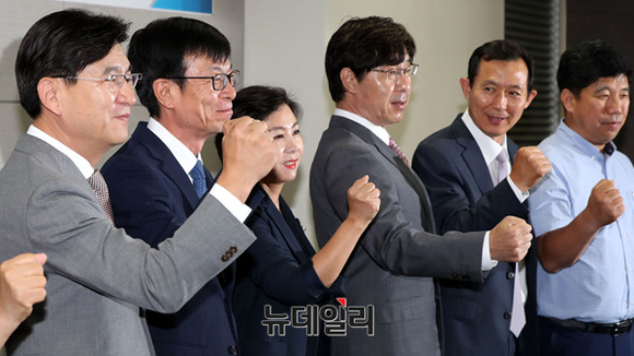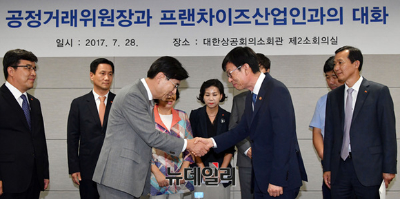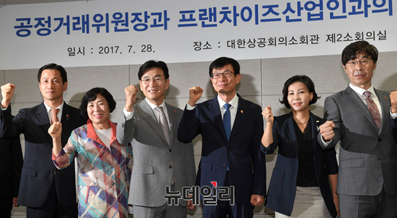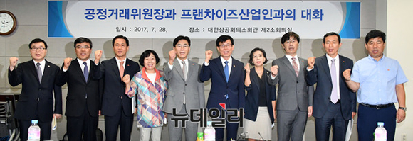 김상조 공정거래위원장(가운데)과 박기영 한국프랜차이즈산업협회장 및 협회 측 참석자들이 28일 오후 서울 대한상공회의소에서 열린 공정위-프랜차이즈협회 간담회에 앞서 기념촬영을 하고 있다. (왼쪽부터) 프랜차이즈협회 임영태 사무총장, 김영철, 김익수, 신신자 부회장, 박기영 회장, 김상조 공정거래위원장, 프랜차이즈협회 송영예, 이규돈, 이범돈 수석부회장, 추광수 부회장.