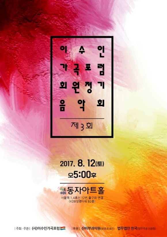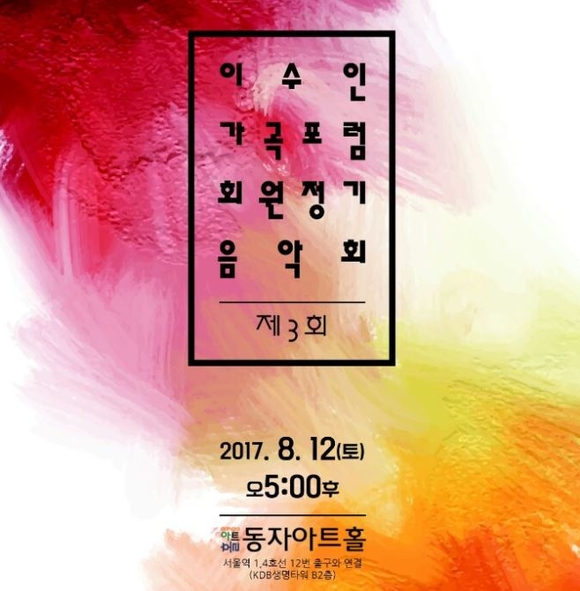 이수인 가곡포럼(이사장 한윤동)이 오는 12일 서울역 동자아트홀에서 제3회 회원정기음악회를 개최한다.손종열 사회로 진행될 이번 음악회에는 소프라노 정유란 강진경 국복순 임창희 임승환 이숙희 양인경 백승희 강석란 유정희 윤영숙이 출연한다. 또 테너 이대형 양동진 한일호 박창근 김명관, 바리톤 박재용 하헌주 신영국 등이 무대를 빛낼 예정이다.이수인 곡 외에 작곡가 최영섭. 임긍수, 신귀복.정덕기. 정영택. 임채일, 김애경의 곡이 연주된다.콘서트에서는 시인 김정순의 시낭송과 깐띠아모중창단 연주, 메조소프라노 조미경 초청 연주도 예정돼 있다. 반주는 피아니스트 최은순이 맡는다.초청 연주를 맡은 조 교수는 1981년 서울대 성악과 1년 재학 중, 같은 학교 경제학과 3학년이던 김효근(현 이화여대 경영학부 교수)이 작시.작곡한 '눈'으로 MBC대학가곡제 대상을 받은 바 있다. 맨해튼음대 대학원, 파슨스 대학원을 수석졸업하고 현재 국민대 겸임교수 및 CK Accompany 대표로 활동하고 있다.