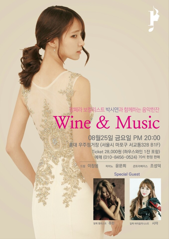 아름다운 음색과 미모로 사랑받고 있는 팝페라 가수 박시연의 콘서트가 오는 25일(금) 열린다.서울 마포구 서교동 ‘홍대 우주정거장’에서 펼쳐질 살롱 콘서트 형식의 '박시연의 Wine & Music 콘서트'에서는 유명 팝, 오페라, 가요 등을 재즈밴드와 콜라보레이션을 통해 팝페라와 재즈로 녹여내는 새로운 스타일의 음악을 선보인다.팝페라 가수 박시연이 우리에게 들려줄 음악은 백만송이장미(가요), fly me to the moon(팝), quizas quizas quizas(볼레로), 서른 즈음에(가요), 인연(가요), cabaret(뮤지컬), habanera(오페라) 등으로 다양한 장르의 레파토리를 들려줄 계획이다.이번 콘서트에는 특히 베를린국립음대를 졸업한 후 현재 활발한 활동을 하고 있는 일렉 첼리스트 쥬린과 이화여대 음대를 졸업한 일렉바이올리니스트 시아양으로 Czardas와 Libertango를 밴드와 함께 협연한다.또한 밴드 세션으로는 피아니스트 윤문희, 드러머 이창용, 콘트라베이스로는 조성덕씨가 참여할 예정이다.