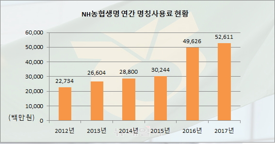 농협생명은 출범 초기인 2012년에 명칭사용료가 227억원 수준이었지만 지난해 496억원, 올해 526억원 수준으로 매년 높아지고 있다.