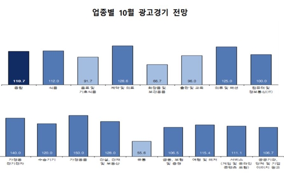 10월 광고시장이 이사철 특수를 맞아 전월보다 광고비가 늘어날 것이란 예측이 나왔다.한국방송광고진흥공사(코바코)가 국내 광고시장의 경기변동을 파악하기 위해 발표하는 '광고경기 예측지수(KAI: Korea Advertising Index)'에 따르면 10월 종합 KAI는 110.7로 조사됐다.해당 업종의 광고주 중 광고비 지출이 늘어날 것이라고 응답한 숫자가 많으면 100이 넘고, 그 반대면 100 미만이 된다.매체별 KAI지수를 살펴보면 △지상파TV 106.1 △케이블TV 102.9 △라디오 100.4 △신문 98.6 △온라인-모바일 119.3으로 조사됐다.업종별로는 결혼 및 이사 관련업종인 △가정용품(150.0)△가정용 전기전자(140.0)의 지수가 전 매체에 고르게 높게 나타났다.이밖에도 △제약 및 의료(128.6) △건설‧건재 및 부동산(128.0)도 광고비가 증가할 것으로 조사됐다.기업규모별 전망지수를 살펴보면 대형광고주(121.7)의 광고비 증가가 두드러질 것으로 예상된다.KAI는 주요 600대 기업을 대상으로 웹조사 패널을 구축해 매월 정기적으로 다음달 주요 광고매체별 광고비 증감여부를 조사하여 지수화한 것이다.종합지수는 각 매체별 지수를 단순평균 또는 가중평균한 값이 아니고 매체 구분 없이 종합적으로 총광고비의 증감여부를 물어본 것이다.
