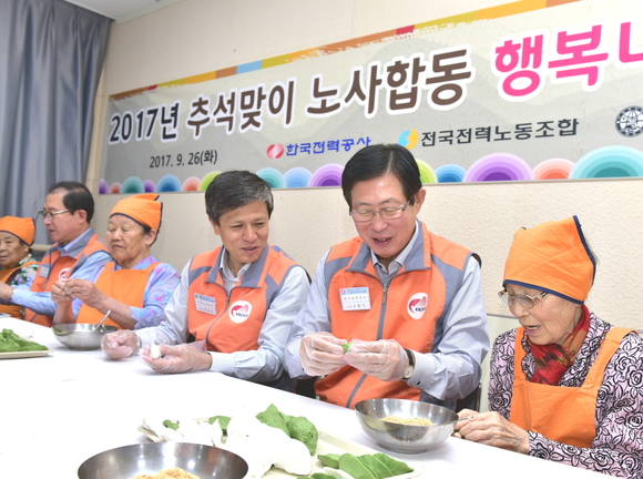 한국전력은 추석을 앞둔 26일 광주 남구에 위치한 사회복지법인 '인애동산'을 찾아 추석 음식 만들기 등 봉사활동을 전개하고 직원들이 모금한 성금 및 지원물품을 전달했다. 이 자리에는 국민의당 장병완 의원도 함께했다.이날 조환익 사장을 비롯한 한전 경영진과 전력노조본부는 취약계층 어르신들과 함께 시간을 나누며 사회책임을 실천하고, 물리치료기, 전자혈압계 등 재활기구와 성인 기저귀, 세탁 건조기 등 1천만원 상당의 물품을 지원했다.또한 이 자리에서 한전은 광주재능기부센터에 '사랑의 쌀 나눔' 성금 1천만원을 전달했다.한전은 9월 25일부터 10월 13일까지 2주간 '추석 명절 맞이 봉사주간'으로 정하고, 본사를 비롯한 전국 300여개 사업소 2만 여명의 봉사단원이 생필품 전달과 전기설비 점검 등 다양한 봉사활동을 전개할 계획이다.조환익 사장은 "지역에 대한 사회적 기여, 지역사회에 대한 배려"를 강조하며 "앞으로 한전은 소외계층에 대한 관심과 지원으로 사회적 책임을 다할 계획"이라고 밝혔다.한전 사회봉사단은 2004년 5월 창단 이래 '세상에 빛을 이웃에 사랑을' 이라는 슬로건 아래 직원급여의 일부를 모아 재원을 마련하여 도움이 필요한 주위 이웃들을 지원하고 있다.