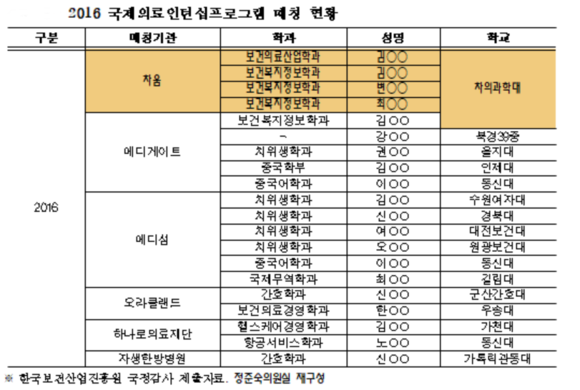 이어 "이런 방식의 국제의료 인턴십 프로그램의 지원자 선발방식을 개선해 악용하는 사례가 다시는 없도록 진흥원이 국제의료 인턴십 프로그램 선발과정을 직접 맡아 객관적이고 투명하게 운영돼야 한다"고 전했다.