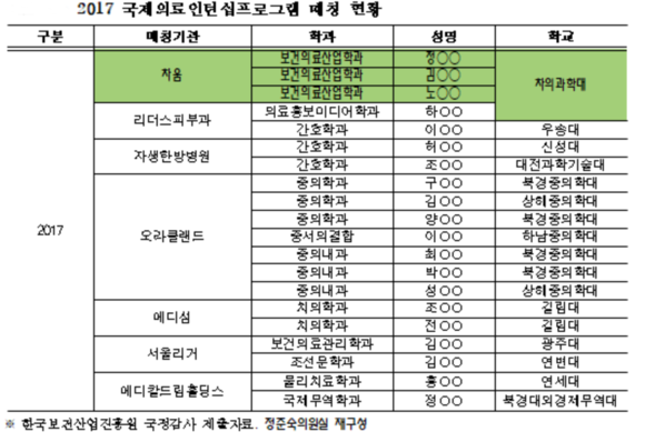 국제의료인턴십 프로그램에는 타 대학생들 26명(2016년 14명, 2017년 12명)도 지웠했지만 이 과정에서 '차움'은 지원한 타 대학생들을 전부 떨어뜨리고, 차의과대생들만 선발했다. -