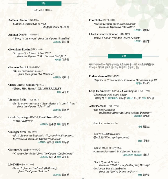 1부는 정상급 성악가 소프라노 김순영, 박하나, 김희선 , 테너 임철호, 바리톤 이응광이 골든 오페라 퍼레이드를 선사한다. 또 2부는 재즈 피아니스트 이우창과 함께하는 크로스오버 음악으로 피아노 오소라, 이우창 밴드(재즈피아노 이우창, 베이스 허진호, 드럼 최요셉) 바이올린 김세라, 기타 김강모, 보컬 이해문, 크로스오버 바이올린 박정은, 보컬 류은주가 출연하여 장르를 뛰어넘는 대중적인 무대와 오페라 콘서트를 선보이게 된다.
