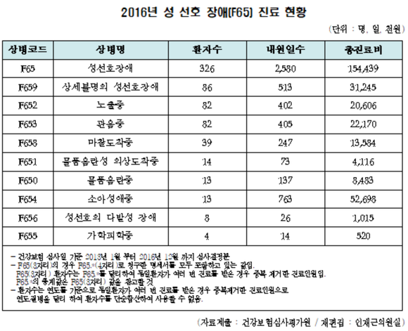 그러나 이른바 ‘변태성욕’ 또는 ‘성도착증’으로 불리는 ‘성선호장애’진료를 받은 사람이 고작 326명에 불과했다. 이는 지난 2013년 166명에 비해 소폭 증가한 수치였지만, 같은 기간 경찰청이 집계한 성폭력범죄자 수 2만9414명의 약 1.1%에 불과한 수준이다. -
