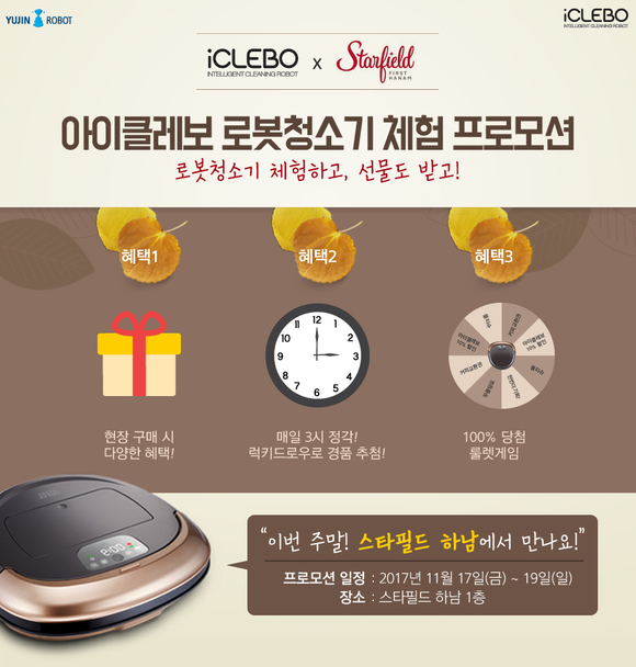 로봇전문기업 유진로봇이 로봇청소기 '아이클레보'의 체험 마케팅 강화에 나선다.16일 유진로봇은 다음달 말까지 총 4회에 걸쳐 소비자들에게 아이클레보의 다양한 제품 라인업을 공개·시연하는 프로모션을 실시한다고 밝혔다.이번 프로모션은 소비자들의 로봇청소기 체험 기회를 확대하기 위해 마련됐다. 특별히 구성된 별도의 테스트 공간에서 아이클레보 전 모델의 성능을 직접 체험해볼 수 있는 것이 특징이다.회사 측은 국내 최대 복합 쇼핑몰 '스타필드 하남'과 이마트의 체험형 가전 전문매장인 '일렉트로마트' 킨텍스점과 하남점에서 순차적으로 행사를 진행할 예정이다. 현장 구매 시 백화점 상품권과 액세서리 패키지 등 다양한 혜택을 제공할 계획이다.오는 17일부터 19일까지 스타필드 하남에서 열리는 행사에서는 아이클레보 오메가, 아이클레보 아이언맨·스타워즈, 아이클레보 아르떼 등의 제품이 전시된다. 방문객들에게는 제품 체험의 기회와 함께 100% 당첨 이벤트를 통해 다양한 사은품을 증정한다.이 밖에도 매일 추첨행사를 통해 60만원 상당의 아이클레보 오메가(1명)와 아이클레보 50% 할인 혜택(2명)을 주는 등의 혜택을 제공한다.유진로봇 관계자는 "사전 체험을 중시하는 소비 트렌드에 따라 올 하반기부터 오프라인 유통망 확장에 주력하고 있다"고 말했다.한편 유진로봇의 아이클레보는 6년 연속 산업통상자원부 '세계일류상품'으로 선정됐으며, 전 세계 30여개국에 수출되고 있다.