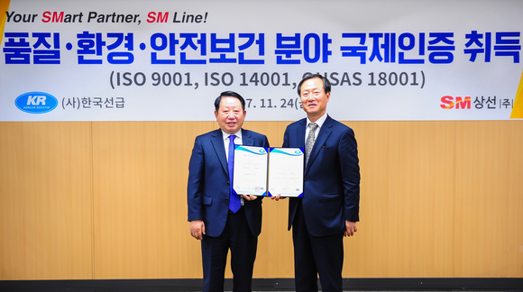 SM상선은 지난 24일 김칠봉 SM상선 대표이사와 이정기 한국선급의 회장 등이 참석한 가운데 서울 여의도 본사에서 ISO9001(품질), ISO14001(환경), OHSAS18001(보건 및 안전) 경영시스템 취득 인증 수여식 행사를 진행했다.이번에 취득한 ISO9001(품질)과 ISO14001(환경)은 가장 최신 버전인 2015년 판으로, 국내 선사들은 내년 9월까지 해당 버전으로 기존의 ISO 인증을 갱신해야 한다.