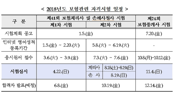금융감독원이 2018년도에 실시될 제41회 보험계리사 및 손해사정사 시험과 제24회 보험중개사 시험 일정을 4일 발표했다.