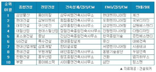 이외 부문별 1위로는 △현대엔지니어링(엔지니어링) △삼우씨엠건축사사무소(건축설계·CM) △동아지질(전문건설) △계선(인테리어)이 이름을 올렸다.