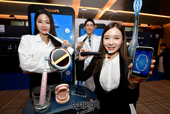 음파칫솔 브랜드 소닉케어가 16일 오전 서울 중구 조선호텔서 열린 소닉케어 최첨단 스마트 음파칫솔 '다이아몬드클린 스마트' 출시 행사에서 포토타임을 갖고 있다.