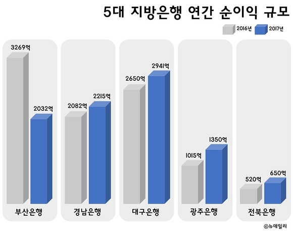 지방은행 간 순이익과 총자산 규모 서열이 뒤바뀌는 상황이 벌어졌다.그동안 지방은행 맹주였던 부산은행이 4분기 실적 부진으로 그 자리를 대구은행에 내주게 된 것이다.◆부산은행만 나 홀로 하락세…순익 감소에 자산건전성 악화5대 지방은행의 2017년 연간 실적을 살펴보면 대부분 전년 대비 소폭 성장한 무난한 실적을 내놨다.이 가운데 체면을 구긴 곳은 부산은행이다. 4분기 805억원의 마이너스 순이익을 거두며 대구은행에 왕좌를 내줬고, 경남은행에도 밀렸다.부산은행은 지난해 2032억원의 순이익을 기록했다. 전년 대비 37.84%(1237억원) 대폭 줄어든 수치다.반면 대구은행은 전년 대비 10.98% 증가한 2941억원의 순이익을 거뒀으며, 경남은행도 전년 대비 6.39% 증가한 2215억원의 순이익을 기록했다.실적 오름세를 주도했던 부산은행이 나락으로 빠진 것은 자산 건전성을 확보하기 위해 미리 충당금을 확보했기 때문이다. 잠재 부실기업에 대해 회수할 수 없을 것으로 추산되는 채권 등을 고려한 행동이다.실제 부산은행의 대손충당금은 2014년 1538억원, 2015년 1906억원, 2016년 1858억원대를 유지하다가 지난해 3246억원으로 대폭 상승했다.이는 부산지역의 경기 침체가 한몫한다. 조선, 해운, 철강, 자동차 등 부산·울산·경남 지역 주력 업종 관련기업의 실적 악화로 부도·도산이 일시적으로 증가한 게 영향을 미쳤다.순이익 감소에 자산건전성도 자연스레 하락곡선을 타며 최악의 상황이 연출됐다.잠재 부실 기업에 대한 자산건전성 분류 강화에 따라 3분기 1.15%이던 고정이하여신비율이 4분기 1.53%를 찍으며 전년 대비 0.63%포인트 대폭 상승했다.은행의 최대 장사 수완인 이자이익을 포함한 총영업이익도 암울하다. 3분기 3128억원에서 4분기 2203억원으로 뚝 떨어졌고, 이에 연간 영업이익은 전년 대비 1.8% 감소한 1조1694억원을 나타냈다.하지만 다시 반등할 기회는 있다. 부실 우려를 선제적으로 막기 위해 충당금을 충분히 쌓은 만큼 리스크관리 강화와 소매금융 중심의 영업을 끌어올린다면 개선 여지는 있다.◆대구銀, 지방은행 맹주 "나야 나"…경남銀 서열 2위 등극웃음꽃을 피운 곳은 대구은행이다. 연이은 악재와 CEO리스크 속에서도 건재함을 과시하며 지방은행 순위 기록을 새로 썼다.현재 대구은행은 박인규 행장의 비자금 조성 의혹에 채용비리까지 엮이면서 은행 전체가 수개월째 비상사태임에도 불구하고 공격적인 대출영업에 내실까지 다져냈다. 고정이하여신비율이 2016년 4분기 1.19%에서 지속 하락하면서 지난해 4분기 0.82%를 기록했다.특히 총자산 규모에서 부산은행과 엎치락 뒷치락 하다가 지난해 3분기부터 앞지르기 시작했다. 부산은행 총자산은 5707억원, 대구은행은 5870억원으로 163억원의 차이에 불과하지만 1년 전과 비교하면 부산은행은 하락세, 대구은행은 상승세에서 승부가 갈린다.BNK금융지주 같은 계열사인 경남은행은 부산은행을 순이익 규모에서 이기며 방긋 웃었다.총영업이익도 전년 대비 7.0% 증가한 8315억원을 기록했고, 순이자마진도 2016년 1분기 2.13%에서 꾸준히 증가해 지난해 4분기 2.21%를 찍었다. 수익성 지표에서 부산은행보다 안정적인 흐름이 지속되는 것을 엿볼 수 있다.자산건전성 지표도 2014년 이후 하향 안정세다. 4분기 고정이하여신비율과 연체율은 각각 0.89%, 0.48%로 전년 대비 0.01%포인트, 0.11%포인트 개선됐다.지방은행 중 가장 덩치가 작은 광주은행과 전북은행은 2016년부터 꾸준한 성장세를 보여 눈길을 끈다.지난해 광주은행과 전북은행의 순이익은 각각 1350억원, 650억원으로 절대값은 상대적으로 작지만 전년 대비 33.0%, 25.0% 증가하며 숨은 강자로 떠오르고 있다.두 은행 모두 이자수익자산 확대와 순이자마진(NIM) 상승으로 이자이익이 지속 증가했고, 부실자산에 대한 정리가 마무리되면서 대손비용률이 하향 안정화되는 등 자산건전성이 한층 개선됐다.또한 몇 년전부터 선제적으로 수도권 영업점을 넓혀 지역에 국한하지 않은 영업을 펼친 것도 실적 상승세를 거들었다.지난해 대출금 비중을 보면 전북 57.7%, 수도권 30.4%였고 예수금 비중도 전북 53.0%, 수도권 42.8%로 타 은행에 비해 높은 비중을 차지하는 것을 볼 수 있다.전북은행의 실적 상승은 지난 2016년 인수한 캄보디아 프놈펜상업은행의 공도 컸다. 프놈펜상업은행의 지난해 순이익은 126억원, 총영업이익은 301억원으로 매 분기마다 오름세다.