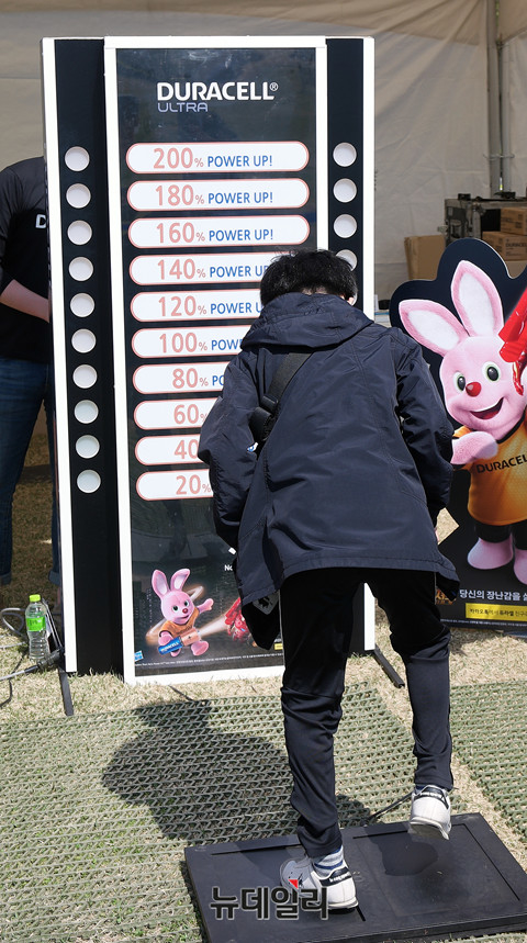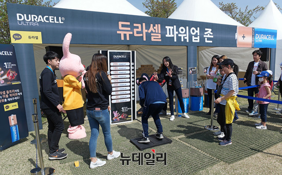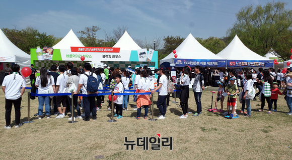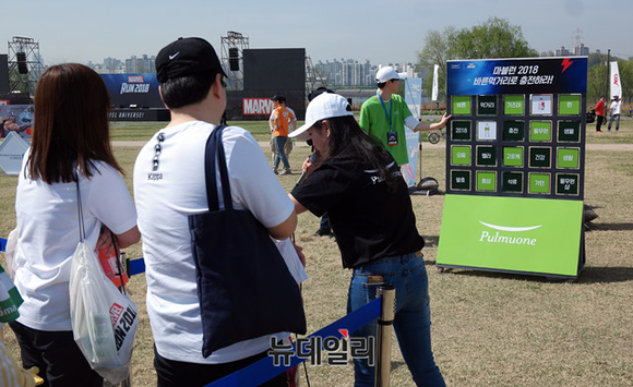 마블의 캐릭터를 주제로 한 러닝 행사인 '마블런 2018'이 21일 오전 서울 한강난지공원에서 열린 가운데 참가자들이 부스 행사에 참여하기 위해 줄을 서고 있다.