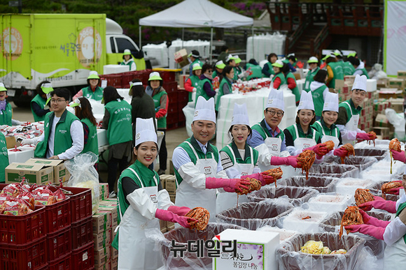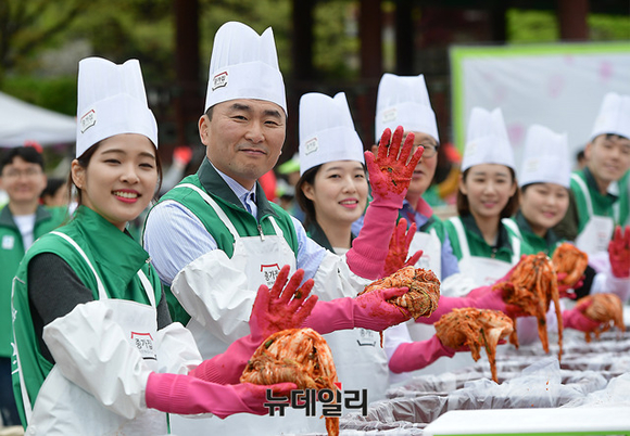 (주)대상 종가집 임직원과 대학생 자원봉사자들이 24일 오전 서울 남산 한옥마을에서 열린 '2018 종가집 봄김장 나눔' 행사에서 봄김장을 담그며 기념촬영을 하고 있다.