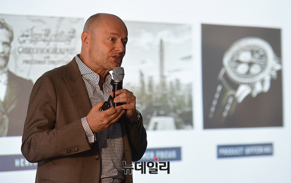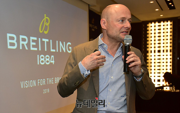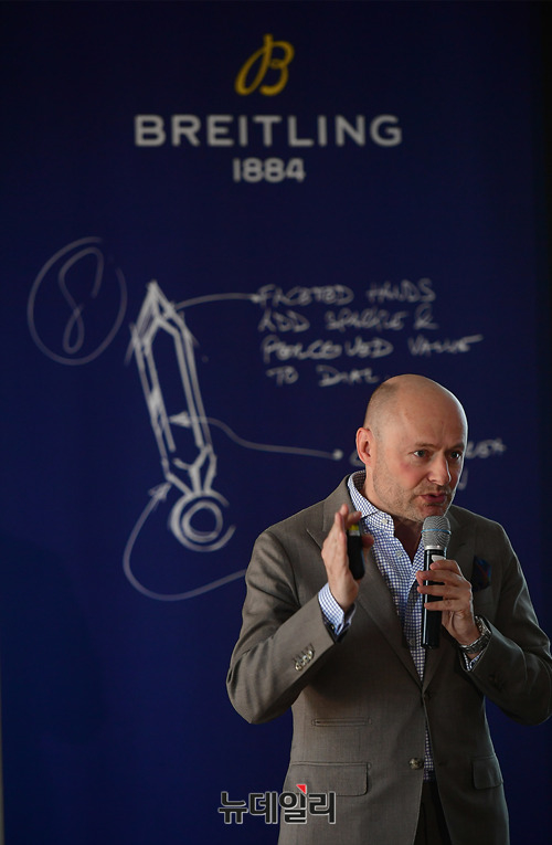 조지 컨(Georges Kern) 브라이틀링 신임 CEO가 25일 오전 서울 중구 웨스틴 조선 호텔에서 열린 기자간담회에서 브라이틀링 역사를 소개하고 있다.