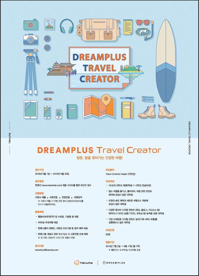 한화그룹의 스타트업 엑셀러레이터 드림플러스는 대학생을 대상으로 여행콘텐츠 크리에이터를 육성하는 7주간의 인턴십 프로그램을 운영한다고 4일 밝혔다.
