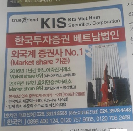 박원상 법인장은 "KIS베트남이 현지증권사 M&A를 통해 시장에 진입했지만 앞으로는 몸집을 키우기 위해서는 증자를 해야 한다"며 "베트남 내 74개 증권사 가운데 실질적인 영업을 진행하는 곳은 30여개에 불과하고 이 중 매물로 나온 곳은 자기자본투자를 잘못해 부실이 난 곳이 많고, 굳이 30위권 밖 증권사를 인수할 필요도 없다"고 말했다.