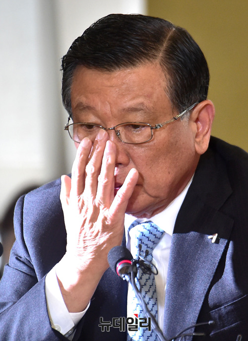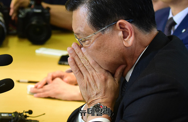 박삼구 금호아시아나그룹 회장이 4일 오후 서울 종로구 금호아시아나 광화문 사옥에서 열린 긴급 기자회견에 참석해 손을 모은채 생각을 하고 있다.