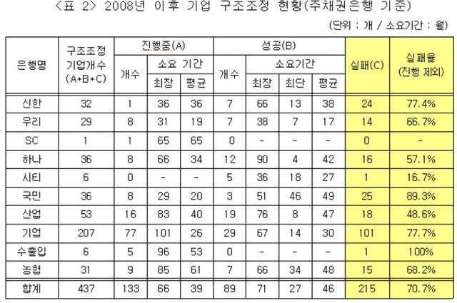 국책은행의 경우, 수출입은행이 관리하는 6개 기업 중 5개 기업은 구조조정 진행중에 있고 1개 기업이 실패했다. 기업은행은 77.7%였다.