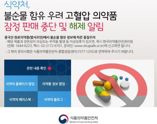 식약처는 "이번에 문제된 의약품을 처방 받은 환자분들은 종전에 처방을 받은 요양기관에 방문하는 경우 문제가 없는 다른 고혈압 치료제로 재처방, 재조제를 받을 수 있다"고 설명했다.