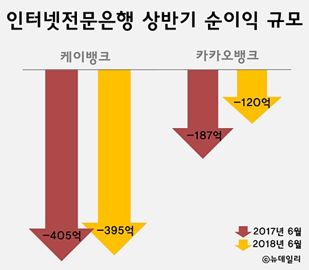 케뱅 120억 카뱅 395억…출범 후 연속 마이너스 성적실적 부진, 영업 한계 '벽'…은산분리 완화로 해결 의문"은행산업 경쟁력 강화 차원에서 규제 완화 논의해야"