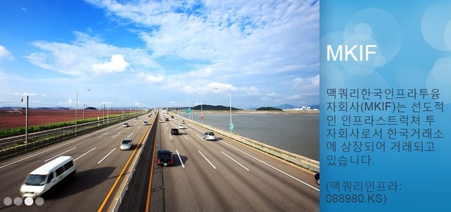 18일 금융투자업계에 따르면 시가총액 3조원 규모의 코스피 상장사인 맥쿼리한국인프라투융자회사(이하 MKIF)는 우면산터널, 서울~춘천 고속도로, 인천대교 등 국내 12개 인프라 자산에 투자해 수익을 내는 인프라펀드다.