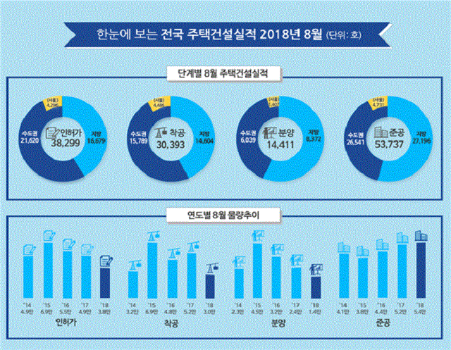 지난달 주택 인허가 실적은 전국 3만8299가구로, 지난해 같은 달보다 21.0% 감소했다. 8월 주택 착공 역시 지난해보다 41.0% 감소한 3만393가구를 기록했다. 2~3년전 분양한 물량이 입주하는 주택 준공 실적(5만3737가구)만이 같은 기간 4.2% 증가했다.