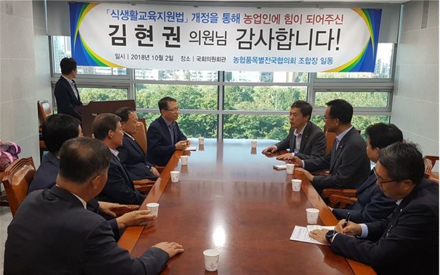 농협품목별전국협의회는 2일 김현권 더불어민주당 의원의 학교과일간식법 법제화에 따른 공로를 인정, 감사패를 수여했다.