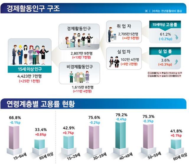 지난달 취업자 증가폭이 8개월 연속 10만명을 밑돌았다. 실업률은 1년 전보다 0.3%p 상승해 실업자수가 100만명을 넘어섰다.통계청이 12일 발표한 고용동향에 따르면 9월 취업자수는 2705만5천명으로 전년 동월대비 4만5천명 증가하는 수준에 머물렀다. 이러한 증가폭은 올 들어 세번째로 낮은 수준으로 8개월째 증가폭이 10만명을 넘어서지 못했다.15~64세 고용률은 20대에서 상승했으나 30~40대에서 하락해 66.8%로 전년동월대비 0.1%p 하락했다. 청년층(15~29세) 고용률은 42.9%로 전년동월대비 0.7%p 상승했다. 실업률은 3.6%로 지난해 9월에 비해 0.3%p나 올랐다. 20대를 제외한 전 연령대에서 실업률이 상승한 결과다.산업별 취업자수를 살펴보면 보건업 및 사회복지서비스업은 13만3천명이 증가했고 정보통신업과 농립어업 등에서도 각각 7만3천명, 5만7천명의 신규 취업자가 발생했다.종사상 지위별로는 임금근로자 중 상용근로자가 33만명 늘었고 임시 근로자는 19만명, 일용근로자는 2만4천명이 각각 줄어들었다.또 비임금근로자 가운데 고용원이 있는 자영업자는 3만4천명, 무급가족종사자는 1만1천명이 각각 증가했고 고용원이 없는 자영업자는 11만7천명이 감소했다.특히 임시근로자와 고용원없는 자영업자, 나홀로 근무하는 자영업자의 취업자 감소폭이 두드러지고 있다.먼저 임시근로자는 올 6월 전년동월대비 13.0%p 감소한 데 이어 △7월 -10.8%p △8월 -18.7%p △9월 -19.0%를 기록했다.나홀로 근무하는 자영업자의 경우도 올 6월 전년 동월대비 -9.0%p를 시작으로 △7월 -10.2%p △8월 -12.4%p △9월 -11.7%p로 나타났다.경기침체, 최저임금 인상 등의 여파로 임시근로직과 자영업자들이 직격탄을 맞은 결과로 풀이된다.9월 실업자는 102만4천명으로 전년 동월대비 9만2천명이 증가했다. 실업률은 3.6%로 전년동월대비 0.3%p 상승했다. 20대를 제외한 전 연령대에서 실업률이 증가한 탓이다.특히 실업자는 20대에서는 1만3천명이 감소했으나 30대부터 4만1천명이 증가했고, 40대도 3만2천명이나 늘었다.청년층(15∼29세) 실업률은 8.8%로 1년 전보다 0.4%p 감소했다.빈현준 통계청 고용통계과장은 "취업자 증가폭의 마이너스 예상도 있었지만 9월은 추석 앞두고 소비재 관련 제조업, 식료품, 섬유 부분에서 미세하게 취업자가 증가했다"면서 "8월 폭염이 해소된 점도 증가에 다소 긍정적 영향을 미친 것으로 보인다"고 말했다.