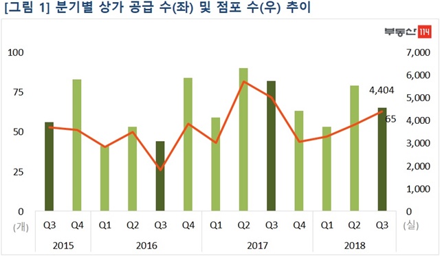 22일 부동산114 조사에 따르면 3분기에는 총 65개 사업장에서 상가가 공급됐다. 여름휴가철, 추석연휴 등이 끼어있는 분양 비수기에 들어서면서 2분기에 비해 18%가량 감소한 수치다. 한국토지주택공사(LH)가 공급한 단지 내 상가도 2분기 13개 사업장이 분양된 반면 3분기에는 6개로 반 토막 났다.