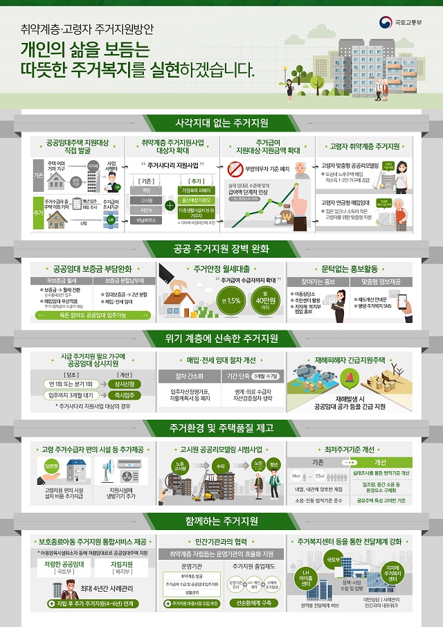 국토교통부는 24일 이같은 내용을 골자로 하는 '취약계층·고령자 주거지원 방안'을 발표한다고 밝혔다. 주거지원이 필요한 취약계층을 적극 발굴하고 공공임대주택에 들어갈 때 보증금 부담을 대폭 완화하는 등의 내용을 담고 있다.